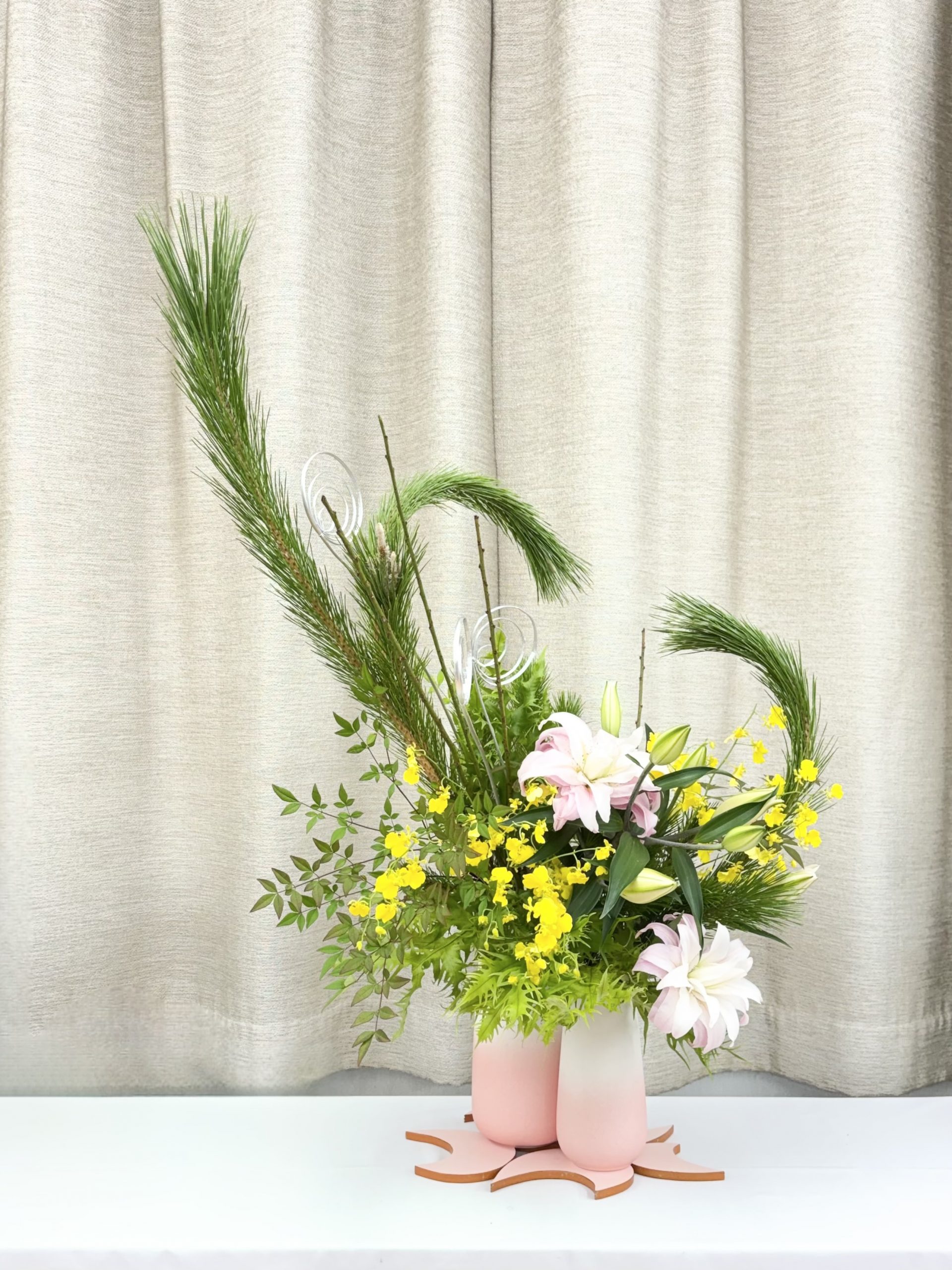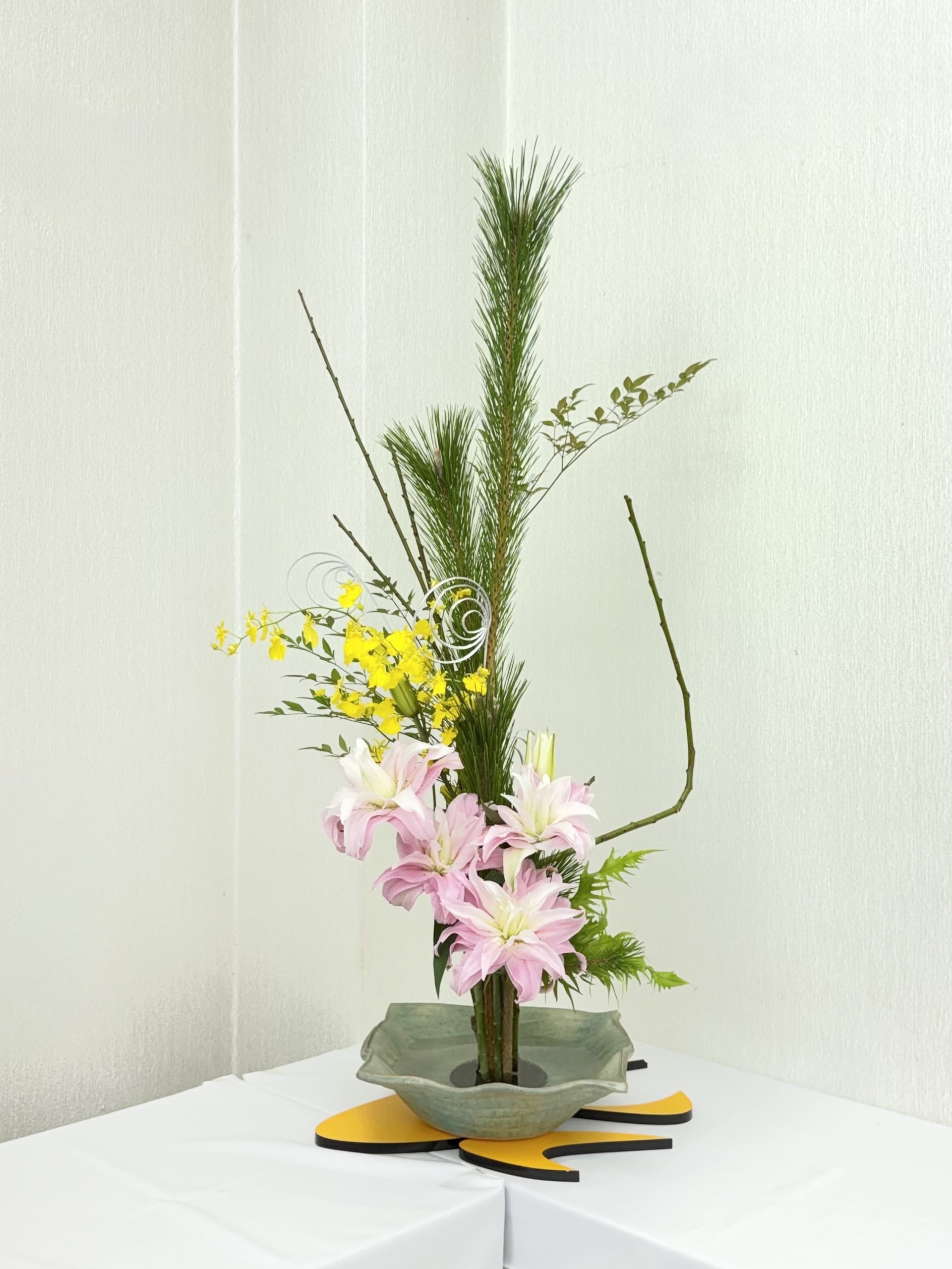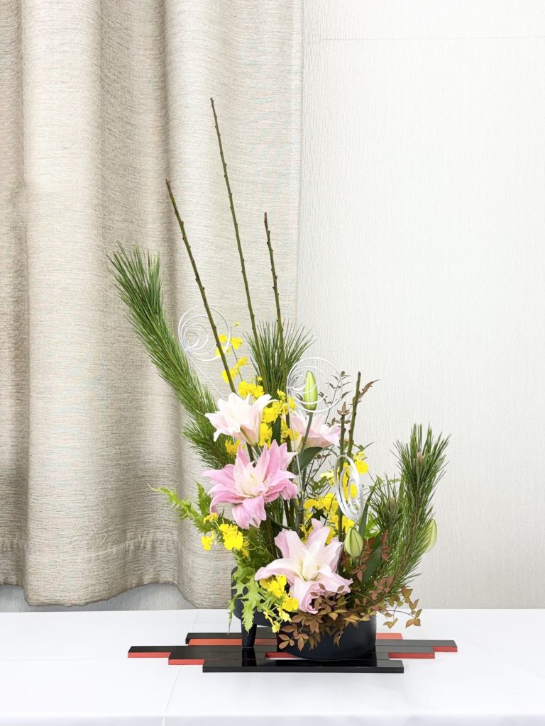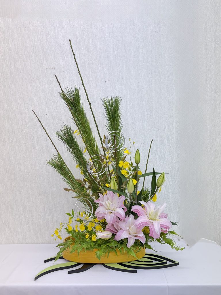 花材・・・ワカマツ(枝物)、ヒメナンテン(枝物)、スワエ(枝物)、ヒリュウシダ(葉物)、八重咲オリエンタルリリー(ピンク色)、オンシジューム(黄色)、柳巻(銀色)