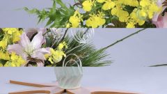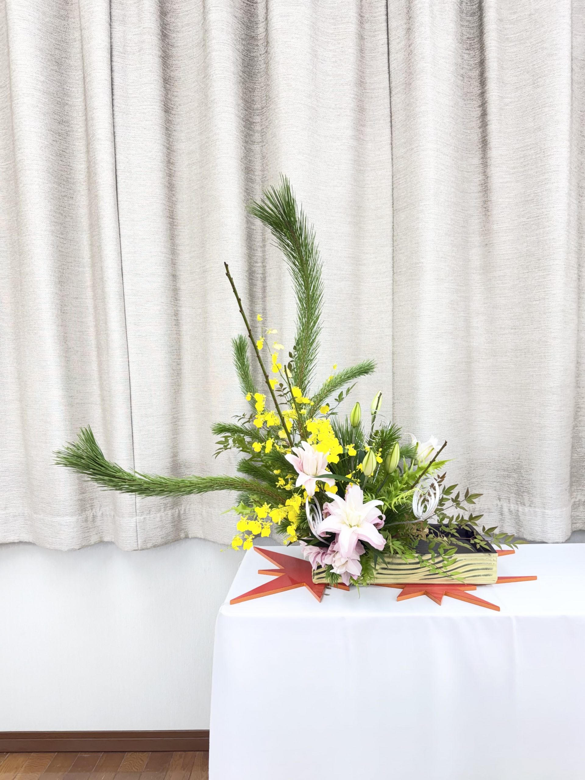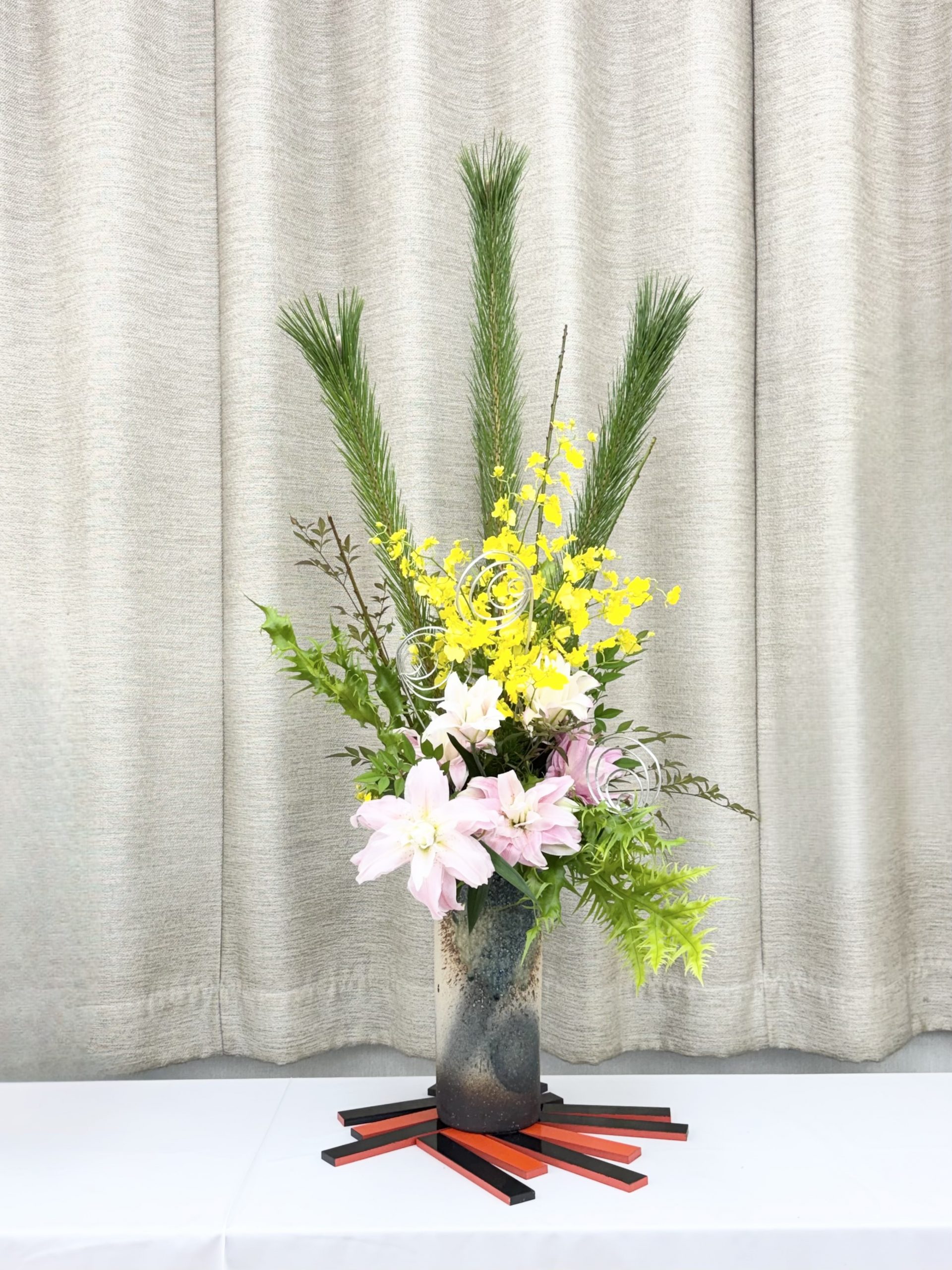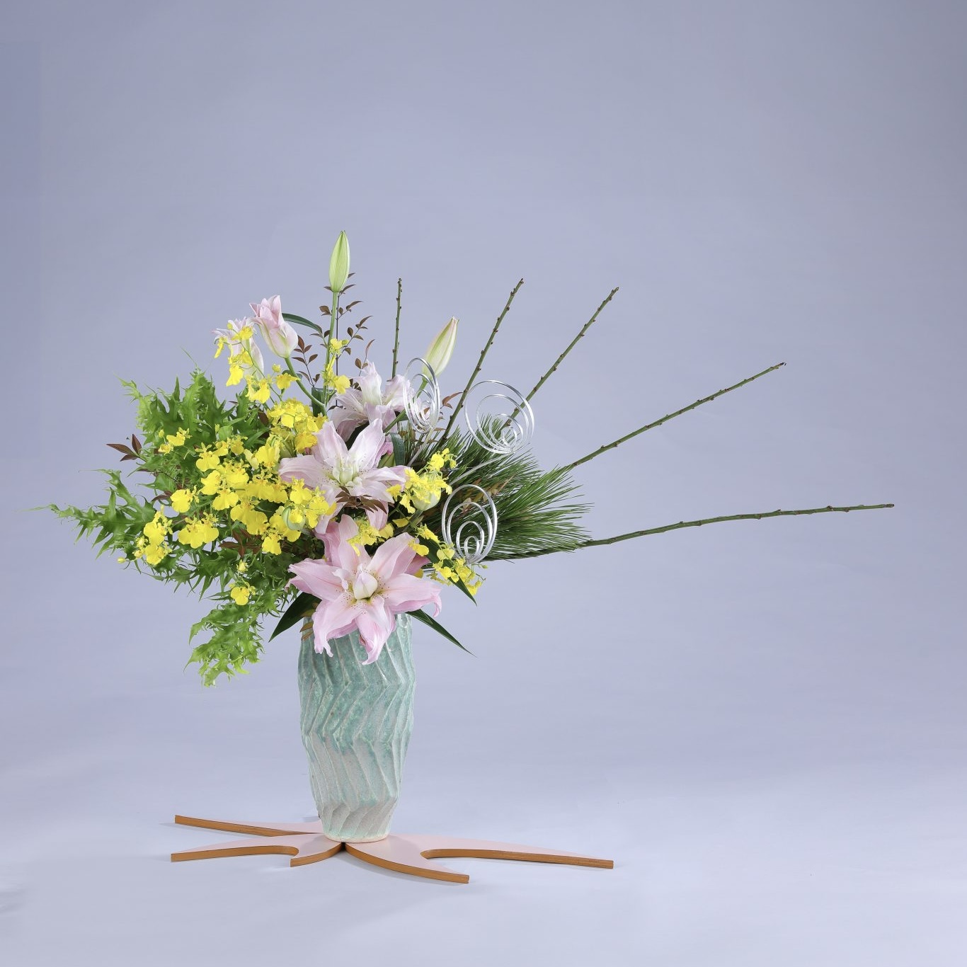 花材・・・ワカマツ(枝物)、ヒメナンテン(枝物)、スワエ(枝物)、ヒリュウシダ(葉物)、八重咲オリエンタルリリー(ピンク色)、オンシジューム(黄色)、柳巻(銀色)